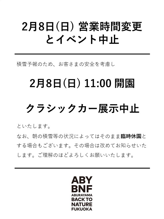 NEWS 2026/02/07 2/8(日) 営業時間変更(11:00開園) クラシックカーイベントについては、こちらhttps://www.aburayama-fukuoka.com/scuderia_nove_corse/