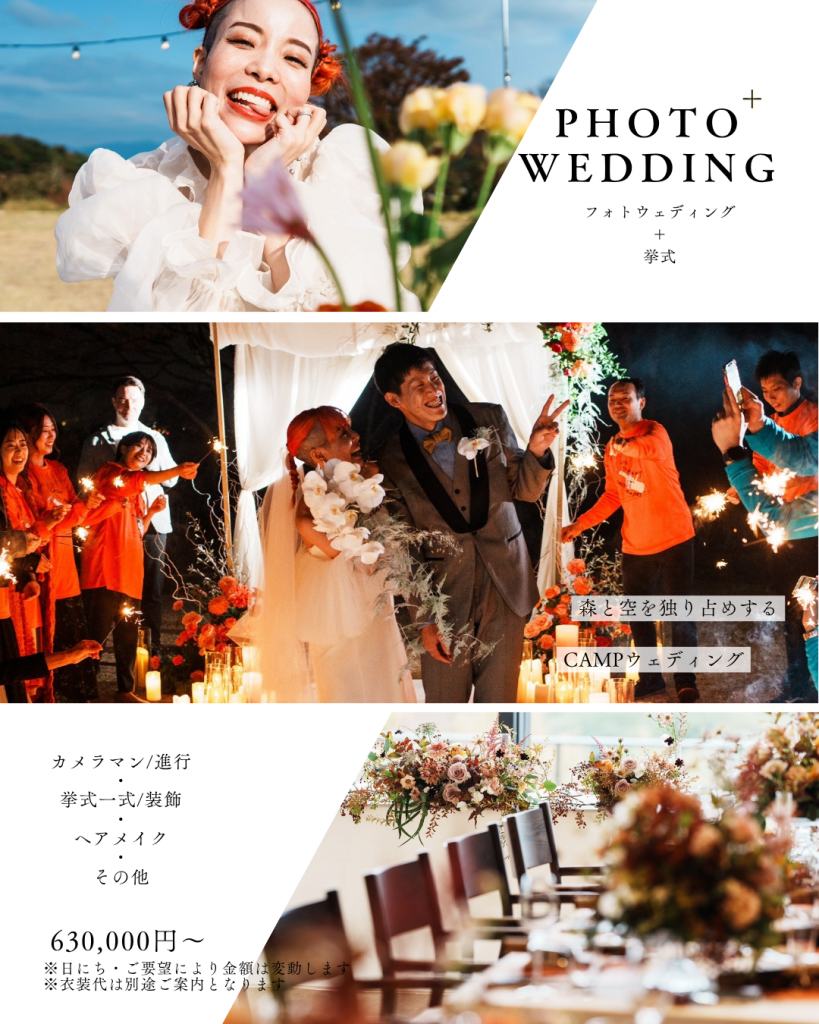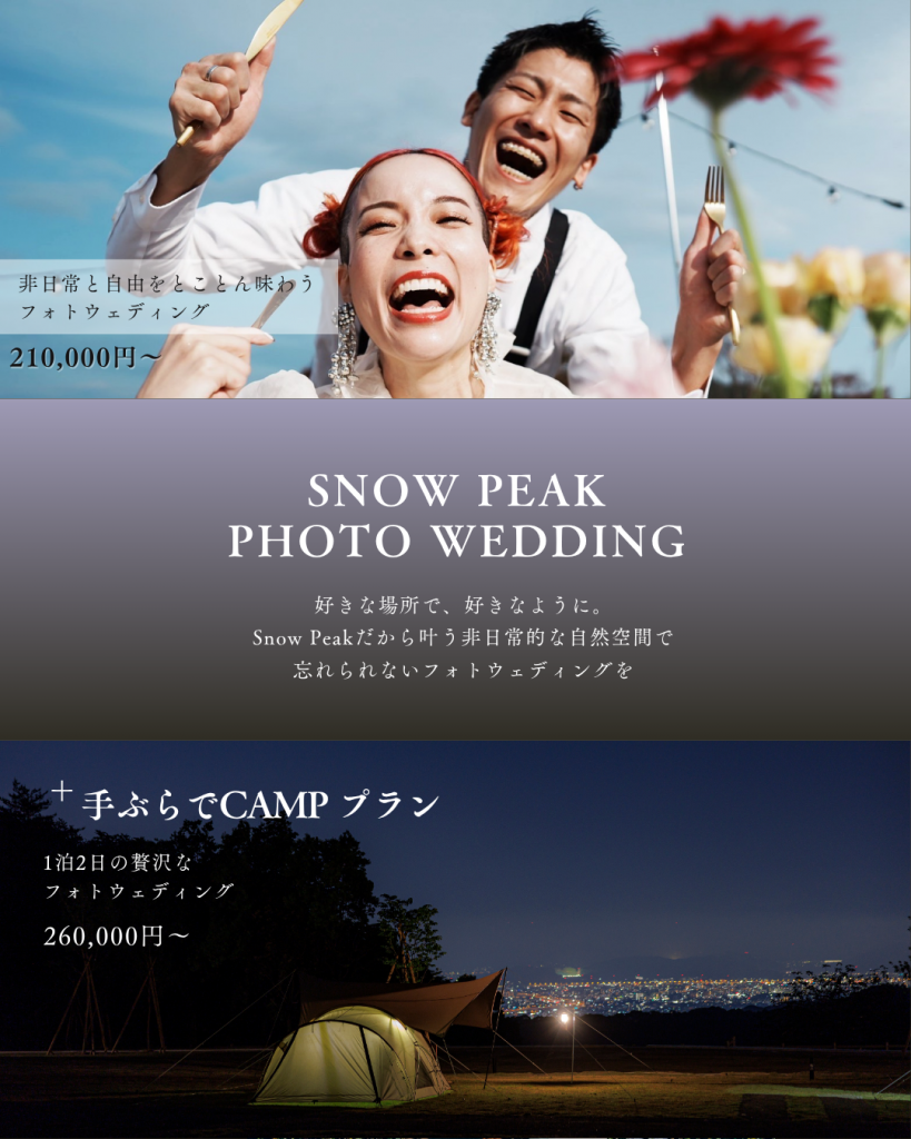Snow Peak キャンプフィールド、Snow Peak YAKEI SUITE、レストラン「Sola Aburayama」、森の中のシェアオフィス「Q‑Nature」など、それぞれの空間が持つ魅力を活かし、おふたりだけの特別な一日をご提案いたします。