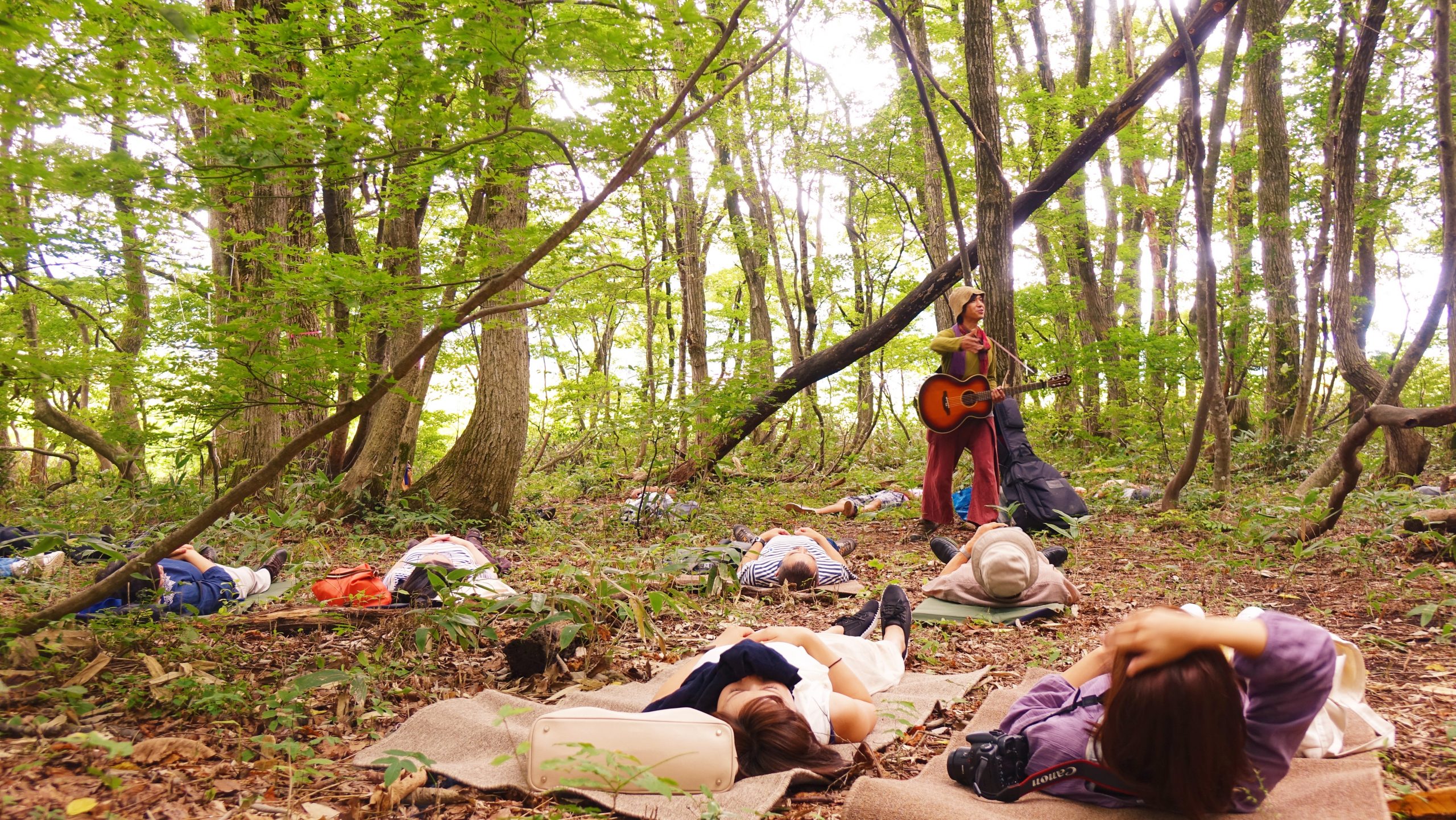 内 容|森林インストラクター兼ミュージシャンとして活動中の山田証さん。自然の中に寝転び、証さんの歌を聴きながら、森の魅力を感じます。