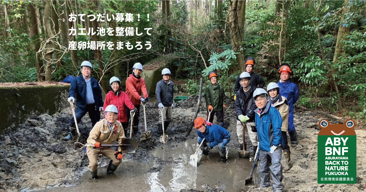 今回はABURAYAMA FUKUOKA自然環境保護員会の環境保全活動のひとつとしてカエルの産卵場所を整備します。本気の作業となりますので、軍手や長靴などの装備が必要です。また対象は18歳以上とさせていただきます。お手伝いに来られる方は以下を最後までご覧いただき申込フォームよりお申し込みください。