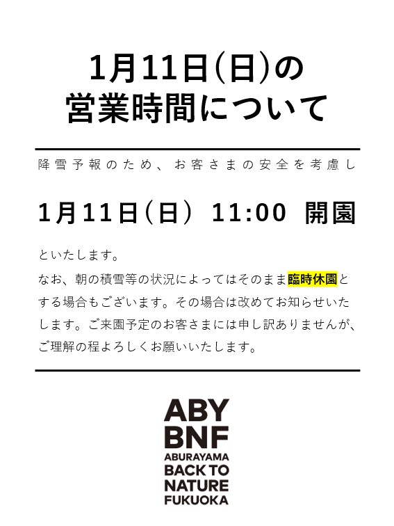 1/11開園時間のお知らせ