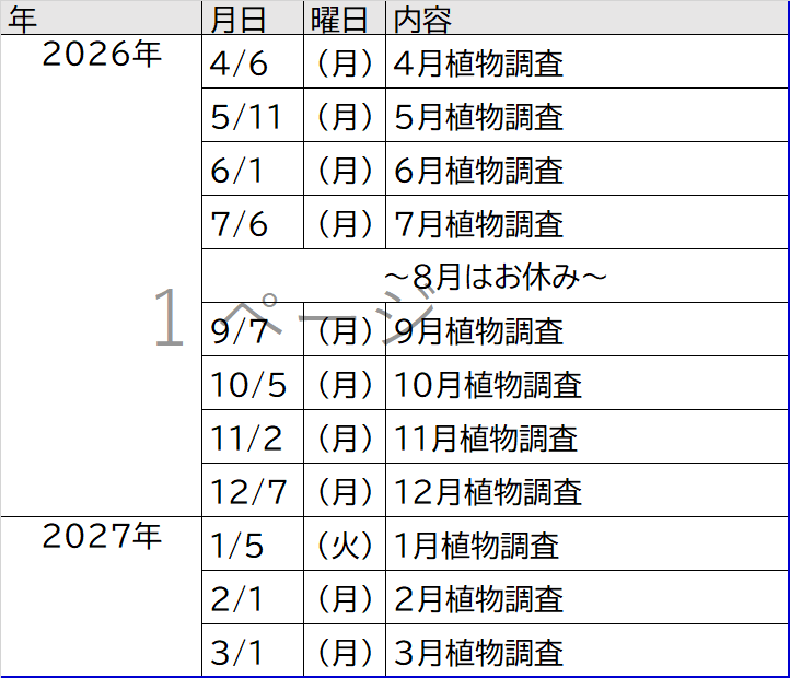 毎月同じルートの中で蕾・花・実がついている植物をリストアップする調査です。