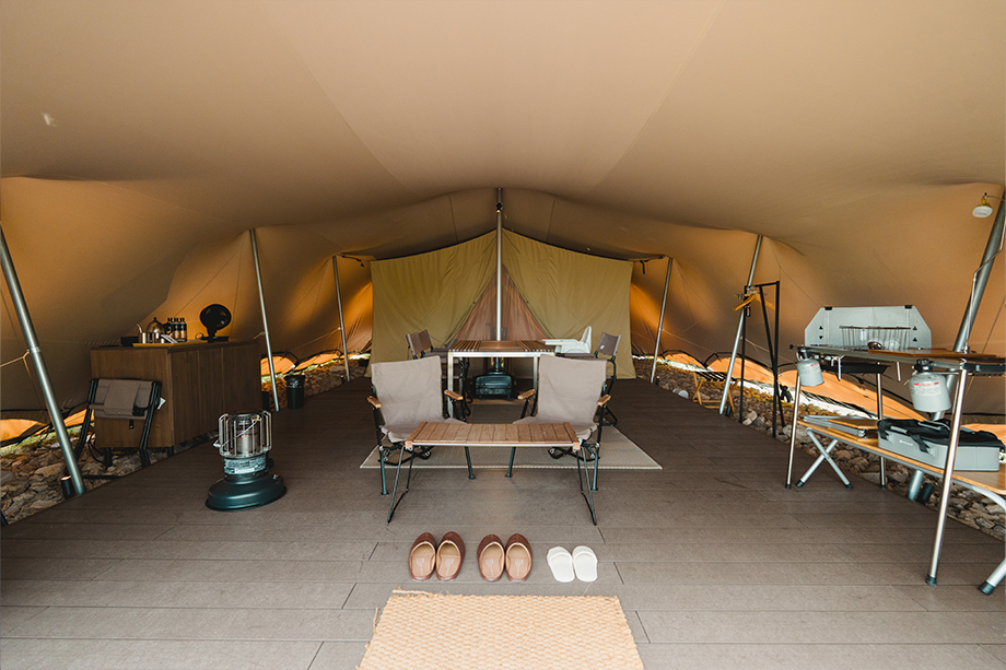 スノーピークがYAKEI SUITEのために開発した、特別仕様のテント「LAND CAVE」を採用。